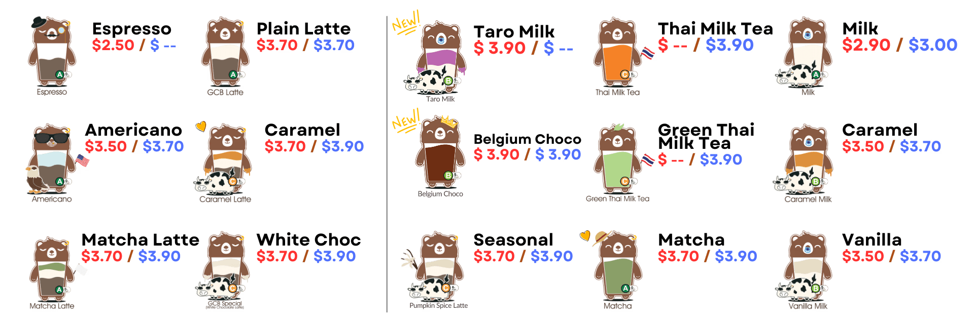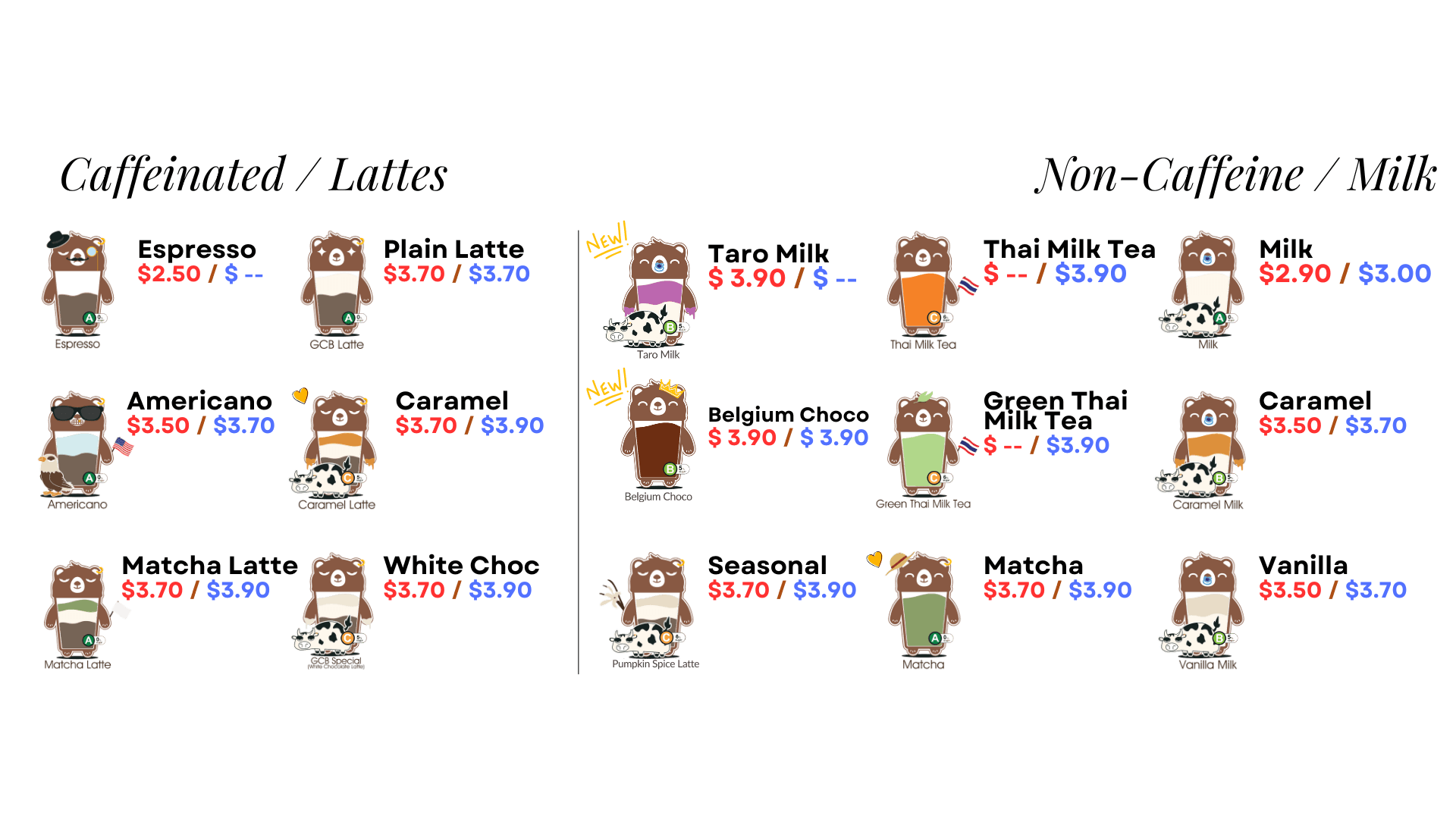 coffee, matcha, and milk tea.